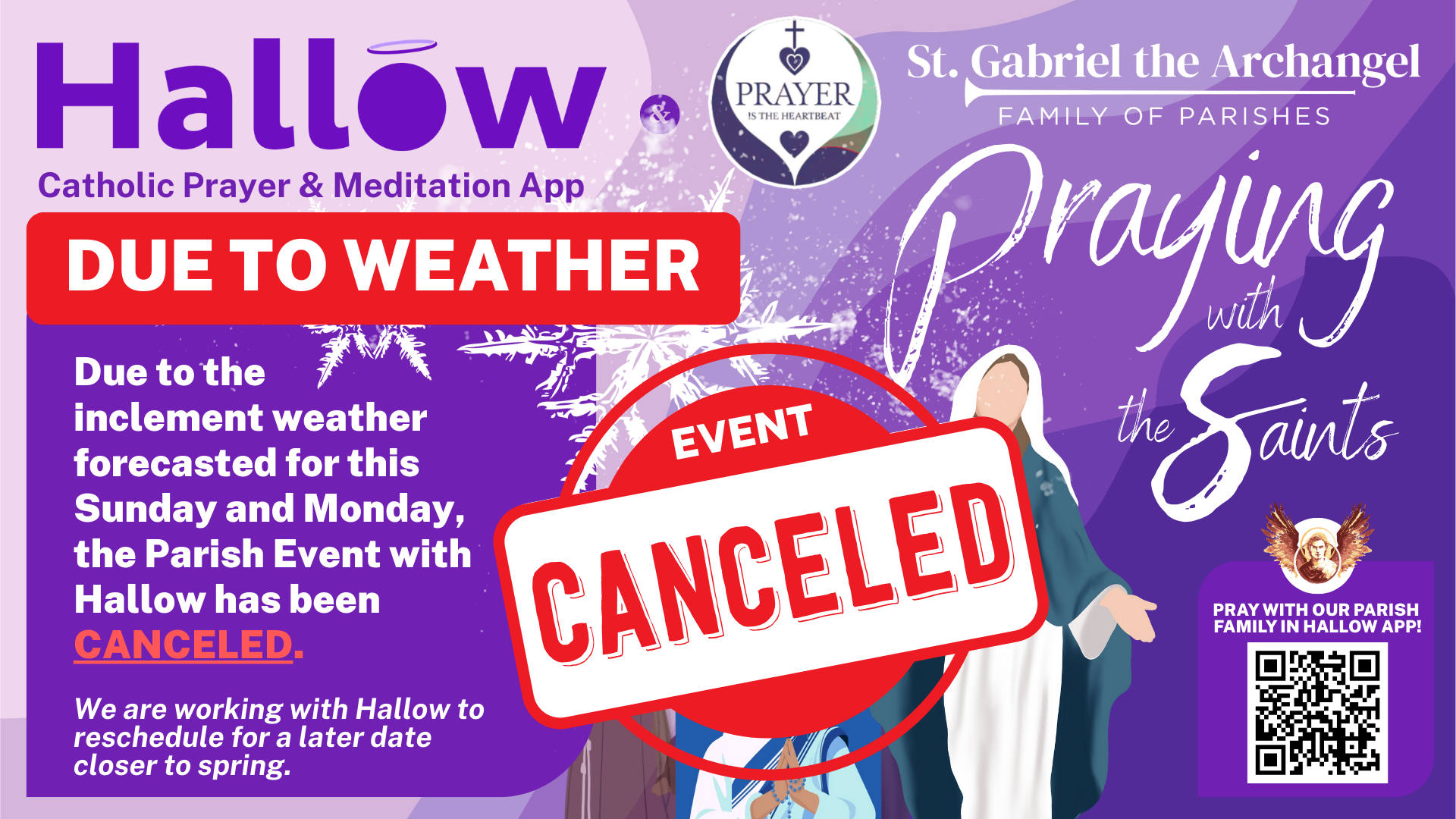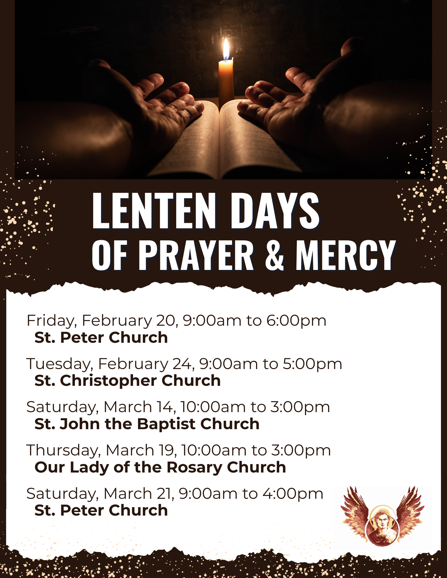 St. Gabriel, as you announced the mystery of the Incarnation to Mary, inspire us to announce the Good News of the Risen Christ to all we encounter. Guide us to know Christ and accompany others to do the same. Present our needs before our Divine Lord so that we may reach a day when Jesus has healed every person’s wounded heart and set them free from their chains. May we proclaim the praise of God our Savior with the Angels and Saints in heaven for ever and ever. Amen.